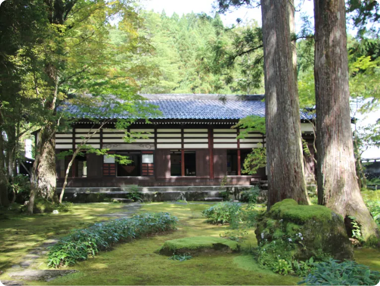 穿過大門後,便可看到一座設有各種庭石及池塘的日式庭園,伴隨高聳的立山杉迎接遊客的到來。這座庭園會隨四季更迭展現不同的風情,從以前到現在,不斷撫慰著旅人的心靈。造訪宿坊的人們會受到山珍的款待,為隔天早上的登山做準備。宿坊也會為他們準備登山服及便當。歩行2分鐘